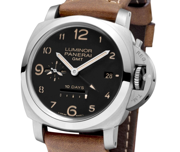 圖文:Luminor 1950 10 Days GMT–44 毫米10日動力儲存兩地時腕錶,錶殼及錶冠護橋裝置均以磨砂精鋼製成,錶框材質則為拋光精鋼,限量生產20枚。