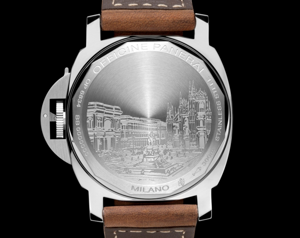沛納海為米蘭推出兩款特別版腕錶以錶敬意。兩款腕錶的底蓋,均刻有米蘭主教座堂(Duomo)正面和維托裏奧埃馬努埃萊二世畫廊(Vittorio Emanuele II Gallery)大門圖案,並只在位於蒙特拿破崙大道(Via Montenapoleone)的沛納海全新專賣店有售。第一款為米蘭而設計的特別版腕錶是Luminor 1950 10 Days GMT – 44 毫米10 日動力儲存兩地時腕錶 (PAM00429),此錶的錶殼及錶冠護橋裝置均以磨砂精鋼製成,錶框材質則為拋光精鋼,限量生產20枚。腕錶黑色三明治式錶盤上的所有顯示,包括數位、10日線性動力儲存顯示、附晝夜顯示的小秒盤、日曆和「Luminor Panerai GMT」字樣,均塗有淡褐色的強力夜光Super-LumiNova®。此外,時針、分針以及秒針上的箭頭,也塗覆上了相同的螢光物料。腕錶配備刷舊處理深棕色牛皮錶帶,搭載P.2003機芯,完全由沛納海在瑞士諾沙泰爾(Neuchâtel)錶廠自製的自動上鏈機芯。