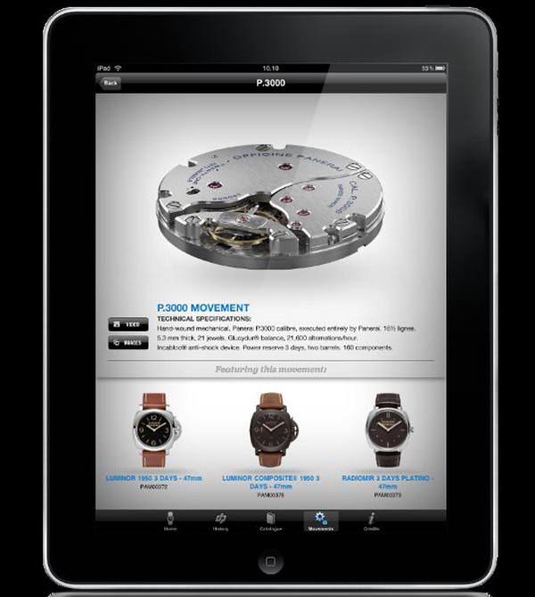 Panerai Catalogue設有專頁介紹沛納海在瑞士的諾沙泰爾(Neuchâtel)製錶廠自主研發製造的機芯,透過圖像、短片和詳細的資料,把這十款自製機芯的技術特點與功能逐一講解,同時能即時顯示所有裝配相關型號機芯的腕錶。Panerai Catalogue是沛納海繼Panerai Magazine之後推出的第二個iPad應用程式,後者專門用於發佈沛納海2011年的最新資訊和作品。Panerai Catalogue為英文版應用程式,可以經以下連結免費下載使用:http://itunes.apple.com/en/app/panerai-cat/id433429616?mt=8