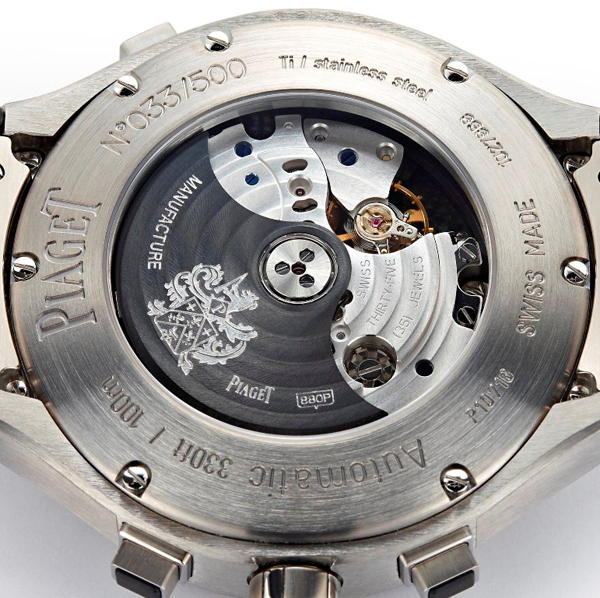 圖說:錶背幾乎被夾板蓋住了計時碼錶的結構,僅有一個導柱輪露出其中,最明顯的當然是PVD處理的自動盤,上面也刻有伯爵獨家的皇家印記。