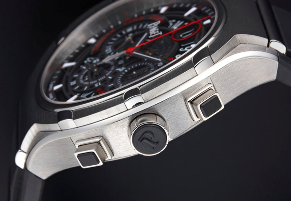 圖說:錶冠及按把頂部加嵌天然橡膠。實際使用下,錶冠稍稍滑手,按把則手感良好,但機芯超薄設計與加大的按把,讓它手感不像傳統導柱輪般明確。