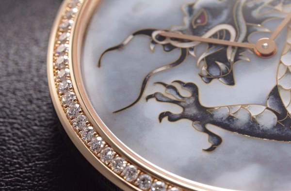 而微縮琺瑯又被稱為畫琺瑯,整個面盤或底蓋就是彩繪大師的畫布,大師得先預先估計燒製的次數,以及每次燒製的溫度對各種顏色的影響,才能按照原本的設計呈現想要的色彩。本次伯爵還使用了稱為"Grisaille"的技法,僅使用兩種顏色,以黑色琺瑯為底色,再加上利蒙日瓷白色琺瑯(Limoges White)繪製龍身,此種琺瑯色彩本身近乎透明,要表現出顏色,就須一層層的塗抹,龍身上的白色與灰色就是畫筆不斷加強的效果,才能有豐富的層次。