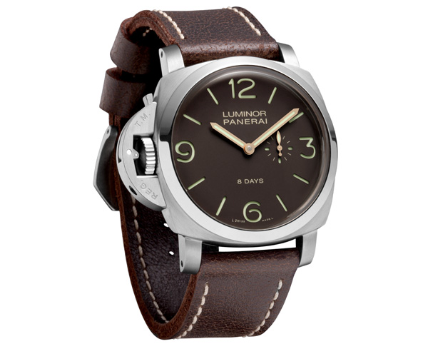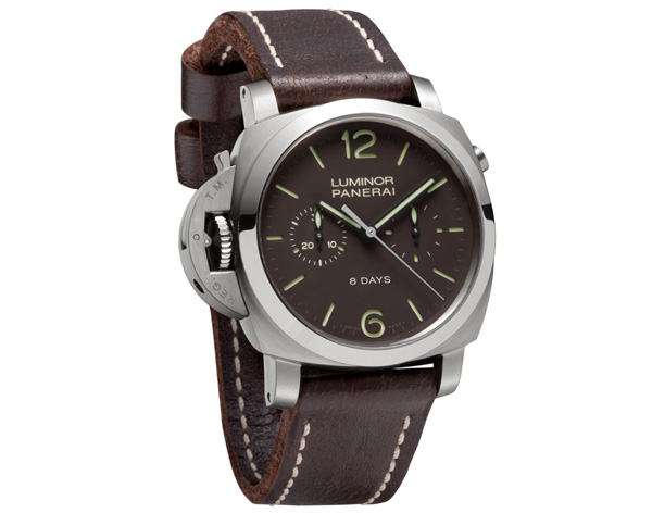 P.2004/9手動上鏈機芯配備三個發條盒,可提供8日動力儲存。此外,它還具有秒針歸零裝置,這樣可將腕錶與參考時間信號精確校時。在機械結構方面,此機芯更配備了超卓計時腕錶必備的導柱輪和垂直離合裝置。棕色三明治夾層式錶盤配有經典沛納海腕錶的特有大型數字與小時標示,此外還配備小秒盤和分鐘計時圈。在歷史上,為讓錶盤即使在微弱的光線下依然有著最佳的辨讀性能,三明治夾層式構造便因而應運而生。它由兩個重疊的圓盤組成,夾心之中的夜光物料讓小時標示和數字清晰顯示。錶盤上印有“Luminor Panerai”和表示機芯長效動力儲存的“8 DAYS(八日)”字樣。Luminor 1950 Chrono Monopulsante Left-handed 8 days Titanio – 44毫米8日動力儲存左撇子單按把計時鈦金屬腕錶(PAM00345)防水深達10個大氣壓(100米),此特別版腕錶限量發行僅150枚。
