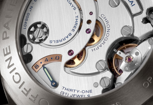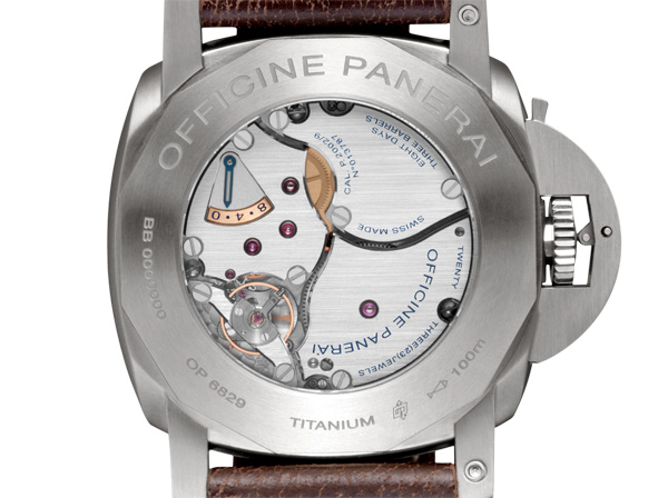 Luminor 1950 Left-handed 8 days Titanio – 47毫米8日動力儲存左撇子鈦金屬腕錶搭載由位於諾沙泰爾的沛納海錶廠自主設計製作的P.2002/9機芯。這款手動上鏈機芯配備三個發條盒,可提供8日動力儲存,動力儲存顯示設於機芯背面。此外,它還具有秒針歸零功能裝置,這樣可將腕錶與參考時間信號精確校時。