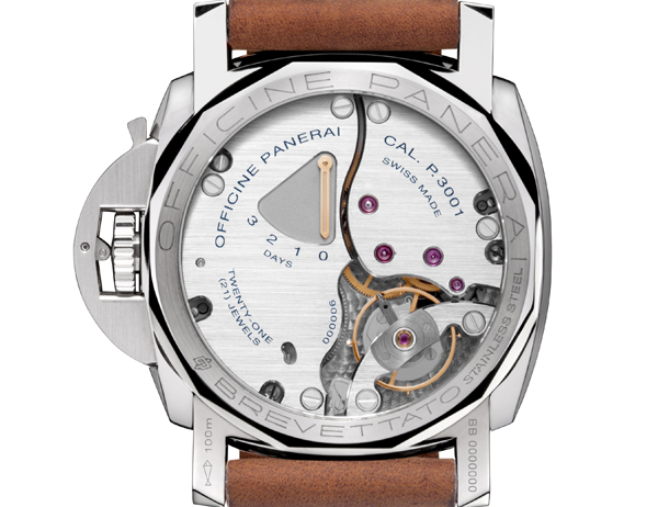 Luminor Marina 1950 3 Days - 47mm採用了手動上鍊的P.3001機芯,機芯由沛納海的諾沙泰爾(Neuchâtel)製錶廠房自家研發製造,直徑16½ 法分,配有特大的夾橋,兩個發條盒可提供3日動力儲存,直徑13.2毫米的平衡擺輪可以轉變慣量,利用外圈的調節螺釘,可以調校擺輪的速率。透過腕錶的水晶錶底蓋,可以窺見機芯的運作,同時亦可讀到主夾橋上的動力儲存顯示。Luminor Marina 1950 3 Days - 47mm的參考編號為PAM00422,限量推出2,000枚。腕錶配備純天然真皮錶帶,以及經典的沛納海磨砂精鋼錶扣。