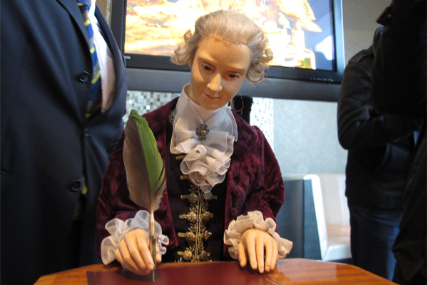 其實 JAQUET DROZ雅克德羅就做出以機械齒輪驅動的活動人偶,分別推出畫家,作家與音樂家,畫家會畫圖,作家會寫字,音樂家則會演奏一段音樂。古董的版本已經被收藏在瑞士的博物館內,而北京故宮中也有14座,據說是康熙時代收藏的。這次展出的畫家是1998年的再製版本,身高約46公分,蓄著銀白髮色的紳士,身著紫紅色十五世紀風格服裝,頭部是以傳統手工製作,眼珠是玻璃材質,頭髮是用真髮製成,服裝是以真絲及金線刺繡縫製而成,端坐於一個約寬30公分深42公分長方木製底座上的木椅,置於一個防震的旅行用盒中。