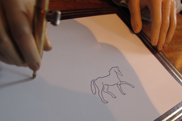 The Draughtsman『畫家』機械人偶複雜的運轉動力來自於推動一組齒輪的發條,由規律並協調手動式凸輪軸所控制。左手輕按在桌上,右手輕輕地揮動羽毛筆,在白紙上逐筆描繪出馬形。而且不只手動,連眼神頭部都會轉動。