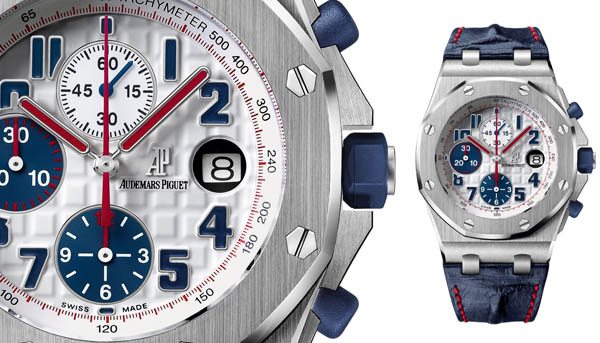 皇家橡樹離岸型「Tour Auto 2012」計時碼錶飾上象徵法國的紅藍色,是一枚專為紳士車手而設、結合精湛技術及無比精確度的時計,彰顯出腕錶的真正本色。此限量版腕錶的底蓋鐫刻環法汽車拉力賽的標誌,並附上特別為賽事設計的錶盒。