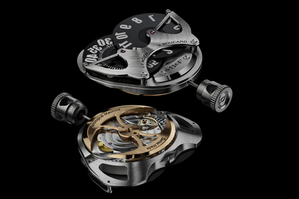 Jean-François Mojon、Vincent Boucard,以及他們在Chronode的團隊,共同研發了HM5的複雜引擎。儘管看起來似乎很簡單,但實際上卻相當複雜!跳時為雙向設計,讓時間能方便地前後調校。時、分盤由兩個礦石玻璃製成,並由一枚寬平的錶橋所支撐。兩個轉盤盡可能重疊,以便將直徑最大化,並為易讀的大時標製造空間。