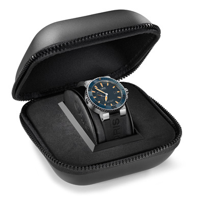 單向旋轉的深藍色陶瓷上圈,擁有60分鐘的刻度標記,不論潛水或其他運動皆可精準掌握時間。搭配深橘色的螢光塗層時標與指針,即使位於漆黑海底依然可清晰辨識。鈦合金表冠防護裝置以Oris人字型螺絲固定,搭載自動排氦裝置與內外側球形切割的防眩藍寶石水晶玻璃鏡面。配備橡膠錶帶或不銹鋼鍊帶,並搭配簡易調節帶扣,可依個人喜好調整合適的配戴長度。防水300公尺。Oris馬爾地夫限量表以品味設計與精實功能,完美貼切潛水及運動愛好者的需求。