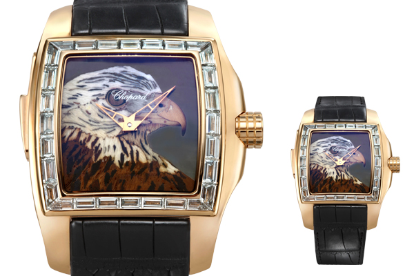 蕭邦頂級珠寶暨腕錶展歷屆來陸陸續續引進不同的動物世界系列珠寶,讓台灣貴賓一窺系列風采!此次來展的動物作品則以貓頭鷹腕錶最具噱頭。動物世界系列貓頭鷹腕錶甫自推出便大受好評,一推出即獲得當年2010日內瓦鐘錶大賞Grand Prix d'Horlogerie de Geneve的最佳珠寶錶殊榮!當時為18K白金鑲嵌黃鑽和鑽石款式,像是一位聰明優雅穿著燕尾服的貓頭鷹紳士。2012年將貓頭鷹化身為嬌俏的姑娘,以18K玫瑰金鑲嵌紅寶石搭配桃紅色絹帶製成,一身喜氣十足討喜。貓頭鷹象徵幸運與智慧,鑲嵌以產量稀少而色彩濃豔的紅寶石來凸顯珠寶的貴氣逼人,身價更為不斐!