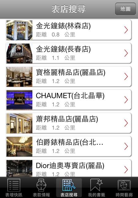 ●表店搜尋:定位您所在的目前位置,依照距離列出錶店清單,還可以切換至地圖模式。其中包括店家地址、連絡電話、販售品牌資訊與圖文介紹,還有錶店活動與推薦錶款列表。