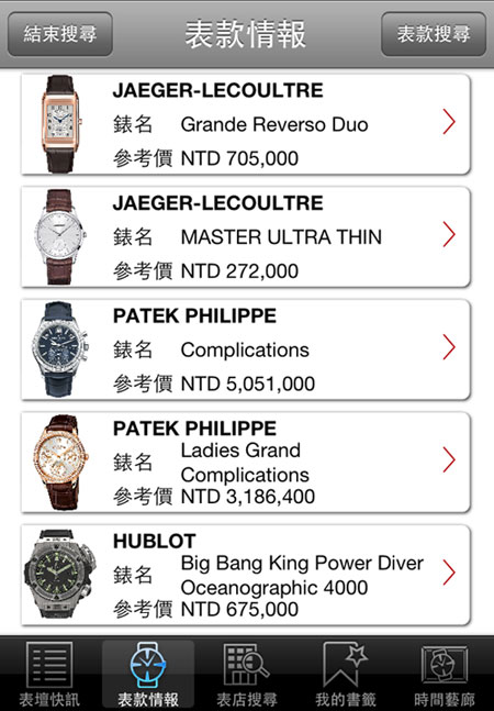 ●表款情報:錶店最新推薦的錶款情報資料庫,可以按照品牌與價位搜索,包含錶款大圖、報價與販售店家資訊,看到喜歡的表款還可以加入書籤!