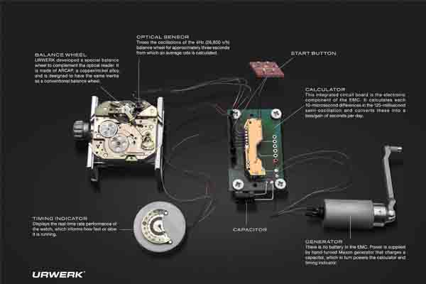 EMC「智能機械機芯」技術由URWERK自行構思、研發及製作,將當代製錶技術帶至前所未見的層次:箇中的意念是製作一枚精確時計之餘,更為錶主提供自行微調及保持精確度的工具;Felix Baumgartner補充道:「一直以來,只有製錶師加上精密儀器工具之助,始能解讀機芯精確度的數據;我們要打破這局面,令錶主也可以駕馭當中奧秘,為此我們經過長時間的耕耘,由零開始,最後成功研發一款操作及閱讀簡易的革命性系統。」