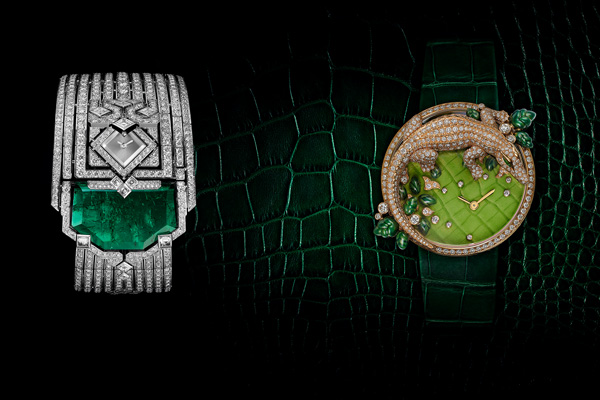 一款L’Heure Envoûtée de Cartier 系列鑽錶,其深邃的祖母綠飽含蔥翠,濃郁而醇厚,腕錶若隱若現,裝飾藝術風格的鑽石線條熠熠生輝,凸顯了置於鑽石褶皺中的精巧錶盤。