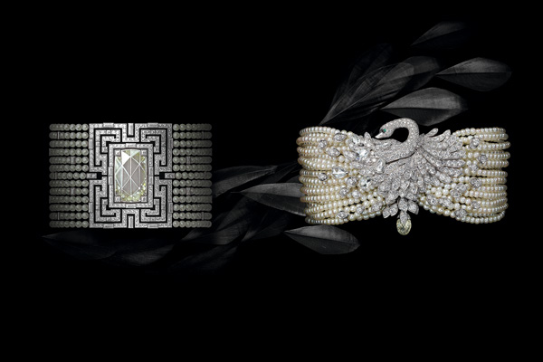 L’Heure Envoûtée de Cartier系列,玫瑰式切割美鑽綻放令人目炫的火焰。位於作品中央的完美幾何造型吸引眾人目光,彷彿裝飾藝術時代優雅風格的一聲迴響,猶如迷宮般精密盤錯。搭配精緻閃亮珍珠的腕飾如一道光,超越一切外在表象,穿梭於時空之間。
