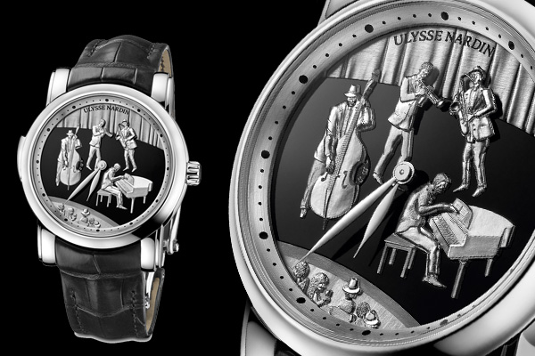 全新瑞士雅典錶《爵士樂三問報時錶》Jazz Minute Repeater工藝大師在黑色縞瑪瑙上加入 18K金「音樂家」,人偶們在表演舞台熱情地為席上觀眾演奏。將報時滑杆拉下時,三問報時裝置可發出清脆悅耳的響聲報時、報刻及報分或其組合,樂隊會隨著時間馬上開始演奏,製作精細的活動人偶會隨著報時功能同步移動,展現腕錶生氣勃勃的精髓。手工雕琢的活動人偶是一貫精緻的藝術品,在腕錶製作技術中是極為罕見的,ULYSSE NARDIN瑞士雅典錶秉持著絕對的製錶傳統,於錶史上也成為了精確與可靠的代名詞,同時也是世界上少數在錶盤上使用活動人偶製作三問報時錶的製錶品牌。