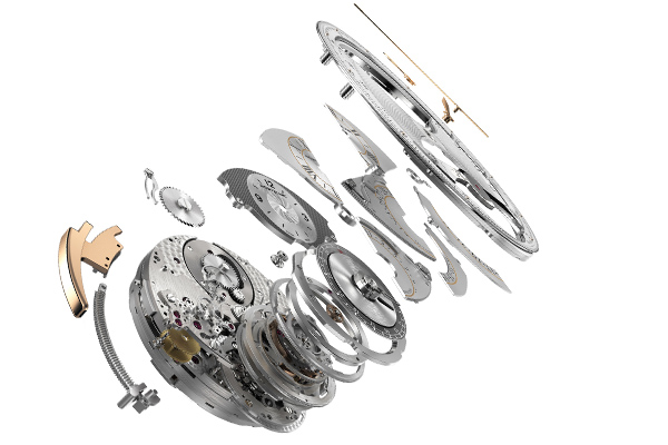 於設計精緻而又複雜的18K純金錶盤上運行的時針、分針與日期指針,均採手工修整潤飾,這需要傳統製錶手工技藝的獨特技術才能夠達成。每一個錶面的內部均採手工鐫刻銀色麥穗扭索紋,下方區域為藍寶石水晶錶橋,而錶盤外部以及位於12點鐘的小時顯示盤採用手工圓形緞面處理。最後,分鐘刻度以手工打造的18K玫瑰金凸緣弧面造型裝飾。