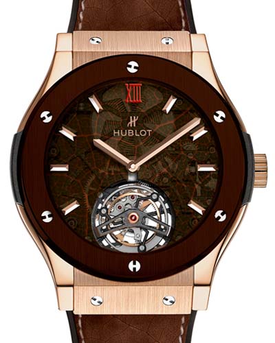 此系列腕錶直徑45毫米,棕色陶瓷錶圈與融合菸葉的錶盤顏色和協一致,共有四種款式可供選擇,包括鈦金屬錶殼、黑色陶瓷錶殼、King Gold錶殼和全球限量30只的King Gold陀飛輪款。King Gold陀飛輪款搭載宇舶錶自主研發的HUB6011機芯,共由155個零件所組成並擁有五天動力儲存,透過錶盤的縷空設計可看見陀飛輪框架。所有的設計研發和生產製造都由宇舶錶工程師和製錶師在自家工廠完成。此外,這系列腕錶配有一條與菸葉同色異調的小牛皮錶帶,展現獨特的ForbiddenX標誌。