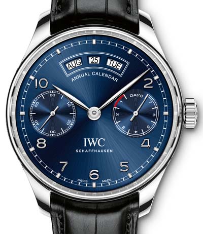 新款IWC葡萄牙系列年曆腕錶(型號5035)中,IWC萬國錶首度推出年曆功能。這項年曆位於「12點鐘」位置,以三個獨立的半圓形視窗分別顯示月份、日期以及星期。其切換機制考慮到每個月的不同長度,卻並不考慮二月份的不同天數,也不考慮閏年的影響。驅動三個顯示圓盤所需要的較大扭力由全新研發的52850型自製機芯提供,這枚機芯集成兩個發條盒的動力,功能強大。