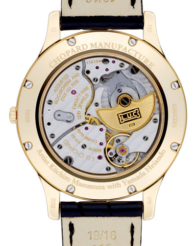 L.U.C 96.17-L機芯由品牌工匠大師親手裝飾,嚴格符合傳統高級製表的品質標準,並在藍寶石玻璃透明底殼下一覽無餘。這款腕錶以18K白金或18K玫瑰金製成。L.U.C XP Urushi羊年蒔繪腕錶搭配黑色鱷魚皮表帶,同時配備以蒔繪工藝悉心裝飾的特別錶盒。表盒外部呈黑色,內部則為蒔繪金色,其八角形設計在東方文化中有著歡樂的寓意。