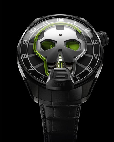 為了與骷髏頭這一形象的原始意象保持一致,HYT決定捨棄分鐘。這個大膽的決定有著雙重意義。第一,它將主要注意力轉移到細管上,移動的液體成為感官上唯一的時間指示器;第二,通過覆蓋了幾乎整個錶盤表面的堅定自信的骷髏頭形象,它將所有的注意力集中到腕表的結構設計上。