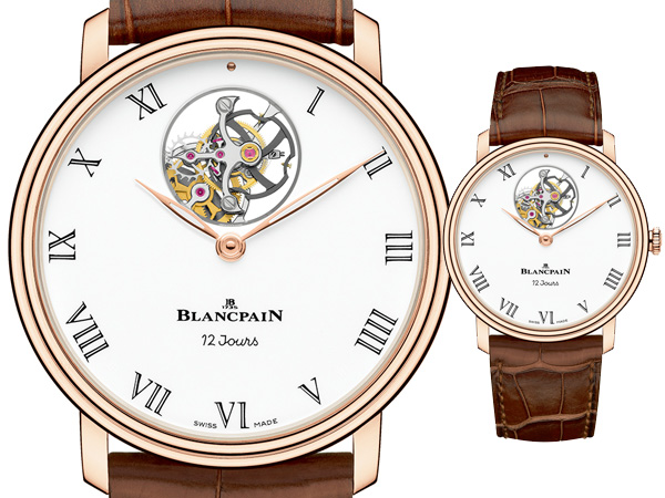 2014發表的長效自動上鍊陀飛輪,突破性地以單一發條盒達成12日的動力儲存,兼顧美學及大格局新思維,突破自1998年發表首創自動上鍊8日動力儲存陀飛輪之cal. 25機芯,並在12點鐘的放大偏心式飛行陀飛輪,能更清晰地看到全新設計的平衡擺輪及擒縱輪的全景,一覽複雜工藝的全貌。無橋版的偏心飛行陀飛輪框架,讓複雜的機制一覽無遺,且每分鐘旋轉一次以補償因重力造成的誤差。,錶背藍寶石透明水晶玻璃清晰呈現機芯精細設計及鏤空自動盤的裝飾工藝巧思,大明火琺瑯面盤搭配手工繪製羅馬時標,及BLANCPAIN經典柳葉型鏤空時標,如藝術品般展現高級複雜腕錶的絕妙工藝。