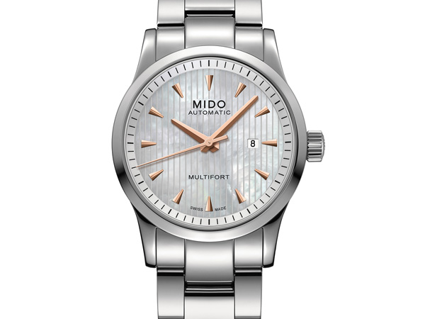 Multifort Lady Mother-of-Pearl 先鋒系列珍珠母貝女仕腕錶以運動流線設計為核心的先鋒系列,注入多種女性元素;採用優雅珍珠母貝錶面,搭配精緻多角面玫瑰金時刻及指針,並首次於珍珠母貝雋刻垂直波紋,讓柔美溫潤色澤更添湖面波光閃爍之美;整體小巧適中的31mm錶徑面盤更顯女性手腕纖細,舉手投足間演譯運動美學。透視後底蓋,以日內瓦波紋及品牌MIDO裝飾機芯,隨著擺輪擺動能完整呈現機芯工藝之美,重新定義女性運動與優雅品味之美。