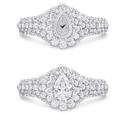 媲美藝術品的The Fascination鑲嵌152.96克拉頂級白鑽,中央為一顆珍稀罕有的38.13克拉D色無瑕梨形鑽石,盡顯格拉夫的精湛切割和打磨技術。這一顆璀璨美鑽採用活動設計,既是精緻手鐲的焦點,也能配上訂製的環圈,成為獨一無二的戒指。格拉夫更巧用匠心,把瑰麗優雅的鑽石腕錶結合在手鐲內,成為閃爍無匹的珠寶腕錶。