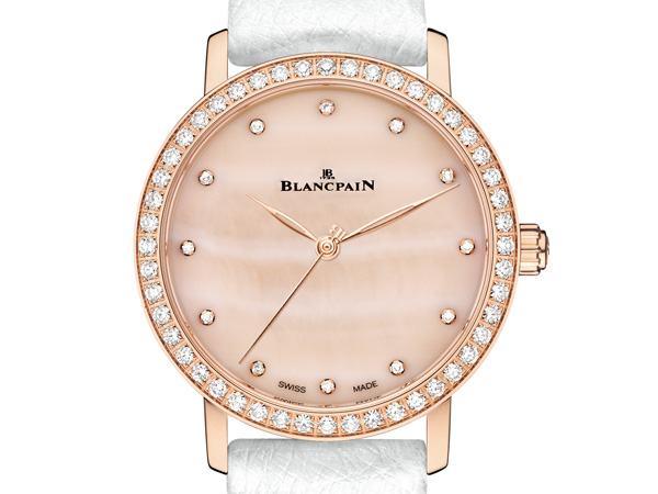 延續寶鉑經典簡潔風格,新推出專賣店獨家的超薄女錶,粉膚色珍珠母貝錶盤搭配紅金更顯高貴;五色錶帶與典雅29.2mm錶徑,配帶時更顯知性美。簡約的大三針腕錶、鑲嵌淡水珍珠母貝錶盤(約0.026克拉)、錶圈鑲嵌一圈鑽石(約0.576克拉)、29.2mm直徑的18K紅金或白K金錶殼搭配白色鴕鳥皮錶帶、自動上鍊並擁有40小時動力儲存、防水30米,套錶共有四條錶帶可供更換:橘/紅/棕色鱷魚皮錶帶及黑色絹帶。