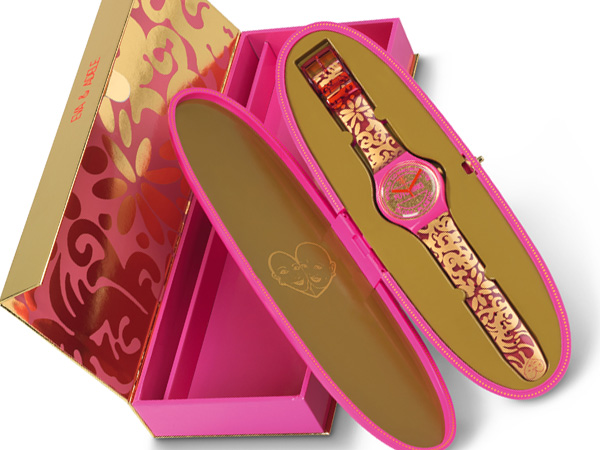 在金光閃爍的表盤背景上,印有三條面向全球的訊息並以亮粉色的文字予以呈現(這顏色也是兩人最喜愛的顏色),分別標示著:World Communicative、Global Plastic和Futuring(全球社交互聯、可塑世界和未來進行式)。他們視腕表及包裝的設計為傳記般的雕塑品,表帶末端的心型標誌是由她倆的頭像所組成, 彰顯了她們鮮明的行為主義風格。