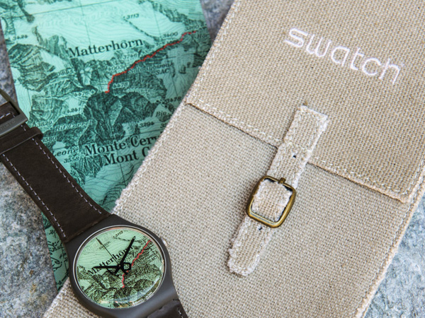 Swatch登頂之路”的表盤圖案為一幅馬特洪峰地圖,其中用紅色線條標出了首次成功登上4478公尺高峰的登山者的登山路徑。黑色的時針和分針代表的是鑿冰斧和吊鉤-對於任何一個有勇氣攀登高峰的人來說,這兩樣工具仍然是必不可少的。外包裝的設計靈感則來自於早期登山裝備的帆布包內的樹脂玻璃盒,共推4478組限量,這正好是馬特洪峰的海拔高度。