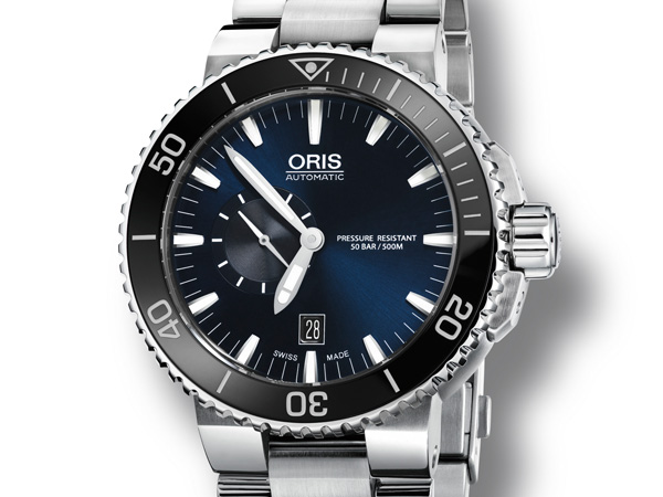 ORIS Aquis小秒針日期錶,設有表冠防護裝置和小秒盤顯示視窗,功能與設計展現恰到好處的平衡。厚實的不銹鋼表殼,搭配可延展的橡膠錶帶或金屬鍊帶。錶盤中漸層的深藍色,則展現沉穩內斂的大氣風範,有如深潛在深海中悠遊自在。