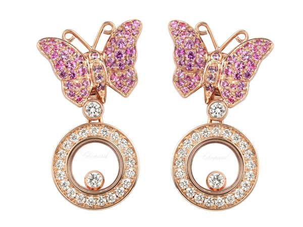 蕭邦Happy Diamonds系列腕錶在18K白金腕錶,鑲嵌總重1.43克拉鑽石與7顆滑動鑽石,讓32毫米錶徑的錶款極度閃耀。全新的項鍊與耳環則以飛舞的蝴蝶為造型,其扣人心弦的外觀设计,加上精巧细腻的製作工藝,營造出柔美動人的女性氣質。以浮雕形式呈现的蝴蝶,周身铺镶粉紅色寶石和鑽石,停靠在Happy Diamonds Butterflies的耳環與項鍊上休憩。顆顆美鑽搭配不同K金材質與錶帶,變化出適合現代女性日常穿搭配戴的鑽錶與珠寶,更顯優雅興致地女性魅力。