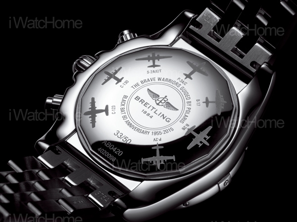 「Chronomat 44 GMT黑蝙蝠中隊60週年紀念腕錶」精鋼打造的錶殼,全面以精美的拋光打磨技術處理,呼應「黑蝙蝠中隊」當年應用先進科技儀器進行的作戰歷程,面盤以藍為主色、計時小面盤以黑色點綴,呼應黑蝙蝠中隊暗黑星空下的勇者美譽。「黑蝙蝠中隊」的黑藍紅三色隊徽,這一象徵榮耀與壯烈歷史的印記,落在面盤9點鐘位置,畫龍點睛般提煉出「黑蝙蝠中隊」專屬錶款的內在靈魂,錶背後底蓋的設計則是鑲刻「黑蝙蝠中隊」過去所用的16款、20型機種之中,最經典的7種機型,它們身影深刻烙印,一如「黑蝙蝠中隊」在台灣空軍史上令人難以忘懷的那段記憶。