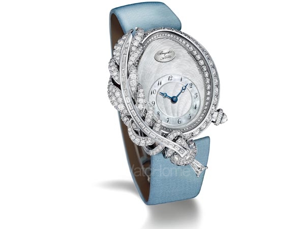 這款腕錶飾有羽毛雕刻,從6點鐘位置的鑲鑽球形附件,伸展至錶框左邊。寶璣的工匠以大小不同的鑽石來表現羽毛的輕盈動態。羽毛的中心枝幹部分鑲嵌長方形鑽石,羽毛部分則鑲嵌大小不一的圓形鑽石,像水珠沿著羽毛滑動。儘管鑽石鑲嵌非常複雜,但腕錶整體卻輕盈、毫不費力。 白色貝母錶盤採用新的手工鐫刻圖案,象徵著羽毛的細膩曲線與靈動纖巧,從6點鐘位置的小錶盤向面盤擴散。經典的寶璣藍鋼指針顯示小時及分鐘,錶框及錶盤內緣均鑲有鑽石,錶冠則鑲以三角形琢面梨形鑽石。這款珠寶傑作再次證明寶璣在珠寶鑲嵌與精雕工藝上的完美造詣。腕錶側面鐫刻以精細的羽毛圖案,取代一般寶璣時計標誌性的錢幣紋。這款腕錶鑲鑽超過4克拉,配備帶有矽材質擺輪游絲的586自動上鍊機芯。