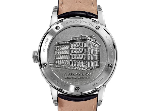 18K白金,自動上鍊機芯,白色錶盤,直徑40mm,年曆顯示,搭配黑色鱷魚皮錶帶。錶背可更換,一款為刻上Tiffany於1874年在瑞士設置的製錶廠圖騰,另一款則為藍寶石水晶透明錶背。全球限量共10只。