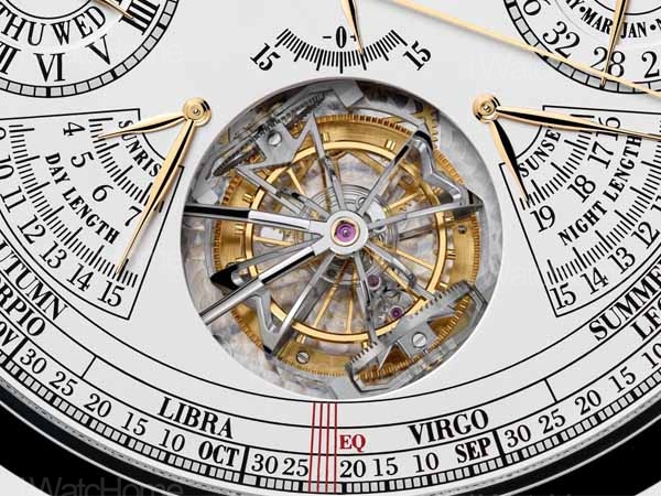 陀飛輪框架上方設有時間等式,顯示真太陽時和平太陽時之間的差異,每年真太陽時最多比平太陽時快16分鐘(約在11月3日左右),最多可慢平太陽時約14分鐘(約在2月12日左右)。每年只有四天真太陽時和平太陽時的時長相同。陀飛輪框架兩側分別設有使用者設定城市的日出及日落時間、晝長和夜長指示。這些指示實際上也與格里高利曆相關,根據每日白天和夜晚小時數計算,而不是制式的時間。