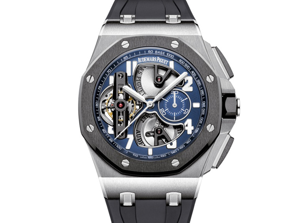 尊貴優雅的950鉑金錶殼與一體成形的計時按鈕護橋首先吸引人們的視線。皇家橡樹系列經典標誌的八角形錶圈以陶瓷製成,並以亮面拋光的六角形外露螺絲作為點綴。在藍色蝸形螺紋裝飾錶盤及陀飛輪、雙發條盒的黑色陽極去氧化鋁製橋板烘托下,錶盤上的數字時標顯得更為醒目。錶盤的另一個設計主軸是對稱:與30分鐘計時器對稱的9點鐘位置造成鏤空,便於欣賞精美的陀飛輪;雙發條盒則在12點鐘及6點鐘位置上下對稱。皇家橡樹離岸型陀飛輪計時碼錶配備藍色橡膠錶帶,搭配950鉑金AP字樣摺疊錶扣。