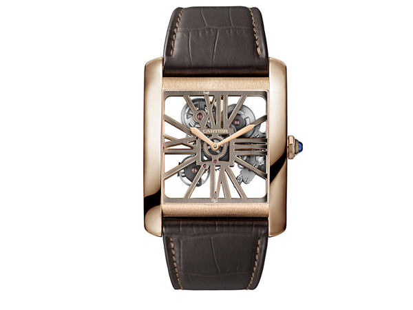 18K玫瑰金搭配八角形錶冠,鑲嵌一顆多切面藍寶石,結合卡地亞9619 MC型手動上鏈機械機芯, 9619 MC型機芯的鏤空夾板及錶橋設計,精巧地構成羅馬數字時標,,打造個性元素與有型有色的腕錶美學,彰顯作品的藝術成就。虛實相隔,Tank MC鏤空腕錶將卡地亞作品的雋永優雅與精緻高雅盡顯無遺。