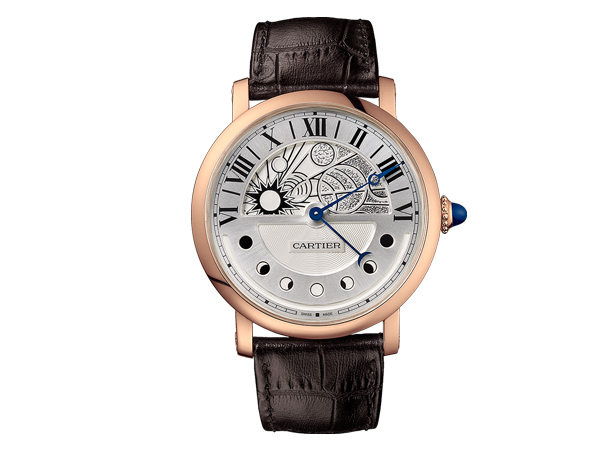 Rotonde de Cartier晝夜顯示月相腕錶風格優雅、對比鮮明,面盤上方指示晝夜變換和時間,下方則是皎潔明月。月相顯示為卡地亞品牌的經典複雜功能,這款搭載逆跳指針月相顯示功能的Rotonde de Cartier晝夜顯示月相腕錶透過一枚創意獨到的面盤,讓太陽與月亮交替顯現,優雅地輪流指示時間。此腕錶搭載9912 MC型自動上鏈機芯,清晰呈現時間的同時,能辨識晝夜時間和月相變幻。