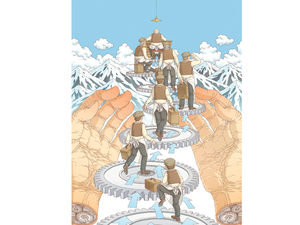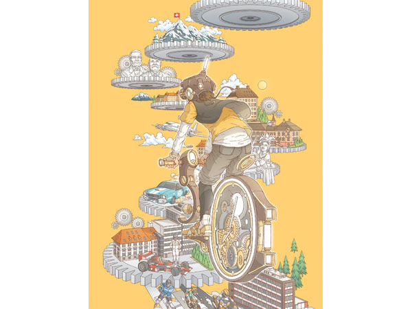 鄭景文<Time Machine >時光單車機,以天梭表TISSOT T - Complication Squelett 3D鏤空腕錶為發想,回溯歷史並以科技先鋒為旨趣,描述熱愛運動的單車男孩騎上時光機,路途遇到天梭表創辦人及佩帶天梭表的南美歌手一起到品牌發跡小鎮(Le Locle)一遊,並與冰上曲棍球員、賽車手相見歡的故事。另一幅畫<The watchmaker >則是向製錶師致敬之作,再先進的腕錶,都少不了製錶師的細緻手作,鄭景文說明:「製錶過程除了靠眼睛之外,還有手感,所以我畫了一雙年邁粗糙的大手,肢體內部用機械來表現,比喻製錶師的技藝。」從小學徒到銀髮製錶師,他們的學程就像登山一樣步步上行、再上行,直至群山之嶺,表現窮盡一生只為專精一藝的精神。