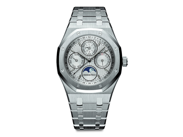 2015年,皇家橡樹系列萬年曆腕錶推出玫瑰金與精鋼材質的不同版本,再度成為萬眾矚目的焦點。全新皇家橡樹系列萬年曆腕錶承續2012年推動的錶殼尺寸革命,以氣勢非凡的41毫米超薄錶殼精彩亮相。全新大尺寸設計巧妙以「Grande Tapisserie」大型格紋錶盤提升腕錶的整體美學及平衡感,令萬年曆顯示更清晰易讀。