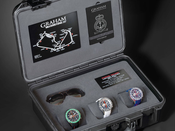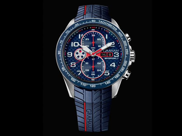GRAHAM創造出多彩且生動的唯美主義腕錶,以傳奇賽車道為主軸,並追求卓越精準和非凡細膩。此款錶的名稱是來自最傳奇的英國賽車道,Silverstone RS Racing包含強烈的現代技術和傳統工藝。這只直徑為46 mm的精鋼腕錶,搭配多彩的錶盤,其設計就像是汽車儀表板。此款錶具備可測量平均速度的測速儀,並搭配首次出現在GRAHAM腕錶中的星期-日期雙顯示窗,其位於錶盤的3點鐘位置。