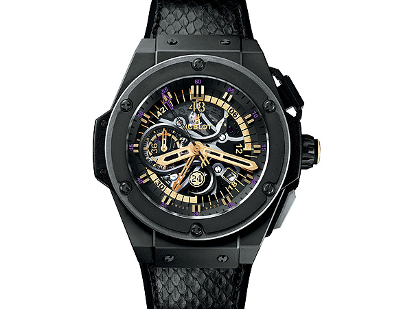 提起Kobe Bryant這個名字,就足以讓所有喜愛籃球運動的人們為之瘋狂。如綽號黑曼巴般的速度與精湛決絕的球風、對勝利的渴望,讓這位光芒四射的巨星與HUBLOT走在一起。2013年為慶祝Kobe Bryant成為品牌大使,HUBLOT選在Kobe的家鄉洛杉磯隆重推出限量版腕錶King Power Black Mamba,包含諸多特別元素以向Kobe最愛的籃球運動致敬:醒目的“24”代表著陪伴Kobe征戰NBA賽場的24號球衣,用金色間隔的錶盤與紫色指針象徵著“紫金王朝”洛杉磯湖人隊的輝煌成就。