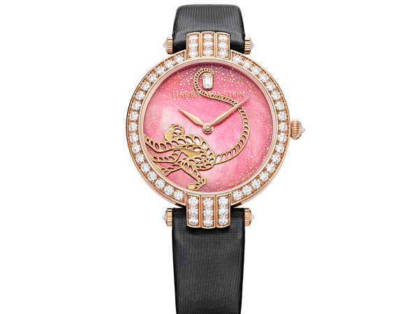 卓時Premier系列猴年限量自動腕錶搭載配備矽材質扁平狀擺輪游絲的自動上鍊機械機芯,透過錶背的藍寶石水晶一覽無遺。日內瓦飾紋圖案裝飾極為精美考究。此款腕錶配備36毫米直徑的玫瑰金錶殼,搭配優雅的黑色絲緞錶帶。其錶圈、錶耳及針扣上鑲嵌以74顆圓形明亮式切工鑽石(總重2.47克拉),綻放璀璨光芒,奪目火彩盡顯海瑞溫斯頓精深的珠寶造詣。此款腕錶僅限量發行8只。