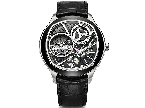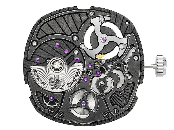 機芯採用倒置結構,腕錶的主要功能元素於錶面上一覽無遺。偏心式機芯擺陀及推進器形成「8」字之姿,而偏心式時、分針於錐形的時標上掠過。設計刻意移除錶盤,黑色塗層枕形機芯盡展各種巧奪天工的傳統潤飾,包括鐫刻有伯爵家族徽章的太陽放射狀機刻飾紋微型擺陀及倒角錶橋、磨砂環形飾紋擺輪及銀色螺絲。深黑色機芯配襯黑色ADLC塗層金質錶圈。