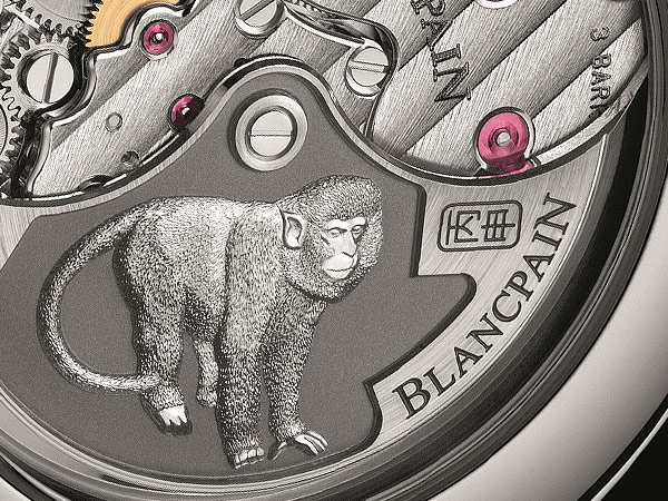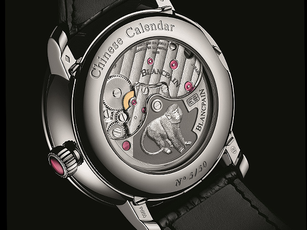 BLANCPAIN 獨家首創中國傳統曆法腕錶,根據數千年的中國傳統基礎曆法所打造,時針、分針以及西曆皆與中國曆法的主要指針並肩排列。擁有古代傳統兩小時計時、日、月(包含閏月指示)、十二生肖,五行元素,十個天干及代表十二星座的地支,形成以六十年為週期的甲子迴圈。月亮週期與傳統中國月份密不可分的關係,BLANCPAIN經典手繪的月相盤在此更突顯其重要性。錶盤顯示閏年,月相,天干地支及生肖,錶背自動盤上則刻有猴年生肖圖騰及丙申年字樣,錶耳下方專利的隱藏式調校及機芯保護裝置,更增加了調校的便利性。