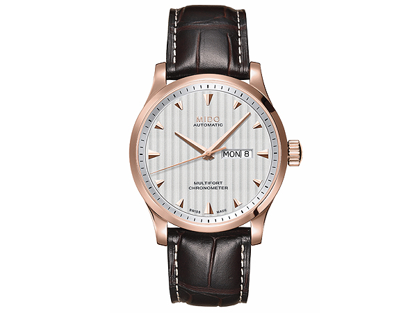 錶帶:咖啡色鱷魚壓紋小牛皮真皮錶帶,搭配玫瑰金PVD不鏽鋼摺疊式扣環