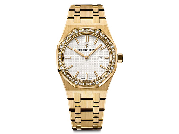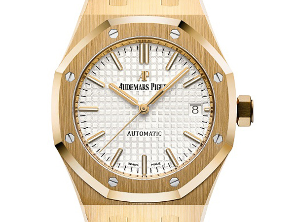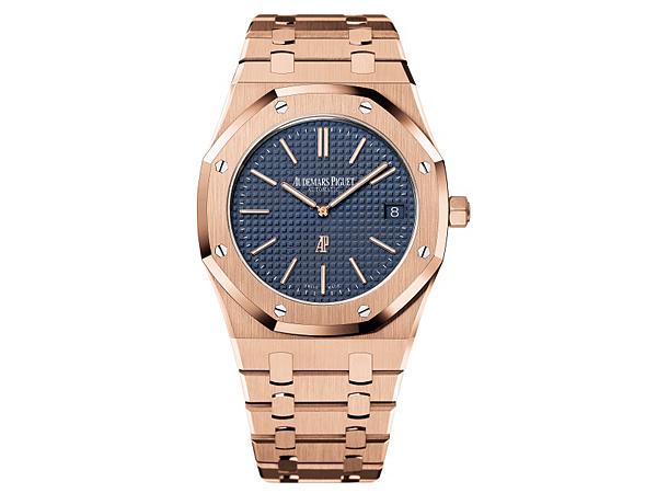 這枚直徑達41毫米的錶殼搭配「Grande Tapisserie」大型格紋裝飾錶盤,特地為搭配黃K金錶殼而設計淡藍色錶面,別具風采。除4點鐘位置可見倒角日期顯示窗和6點鐘位置的小秒針外,另有特別吸睛的螢光塗層黃金立體時標和皇家橡樹指針。